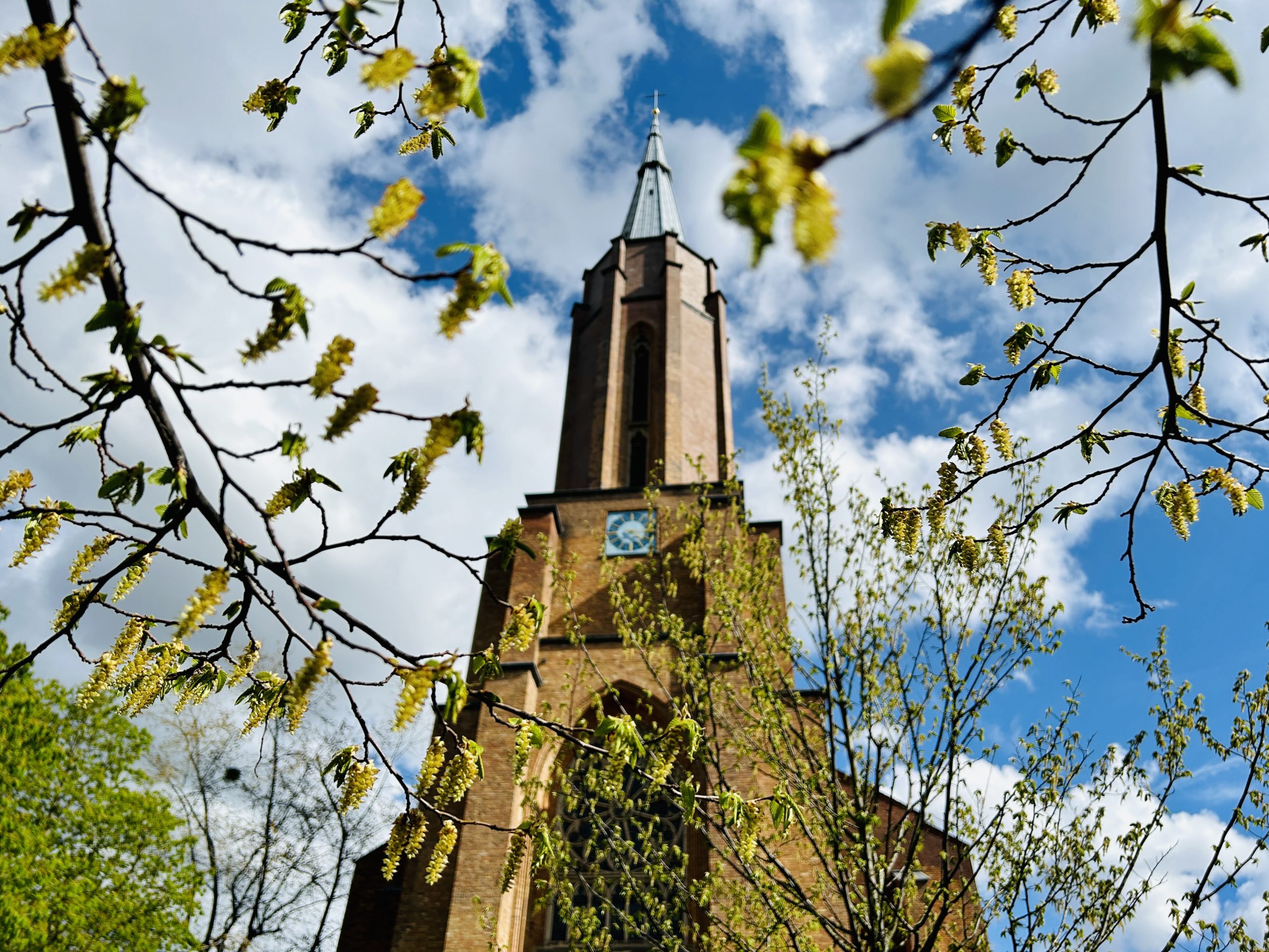Der offene Platz vor der Kirche ermöglicht eine Trauung unter freiem Himmel, niedrigschwellig, sichtbar und einladend. Gleichzeitig bietet die Evangelische Kreuzkirche mit ihrem eindrucksvollen Turm und dem lichtdurchfluteten Innenraum einen geschützten, feierlichen Rahmen.
